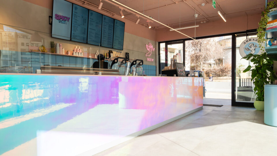 Inspiriert von italienischem Chic verleiht die Thekenverkleidung mit DM Hollywood Blue von SIBU DESIGN in schillernden Rosa- und Blautönen dem Raum eine elegante Note.